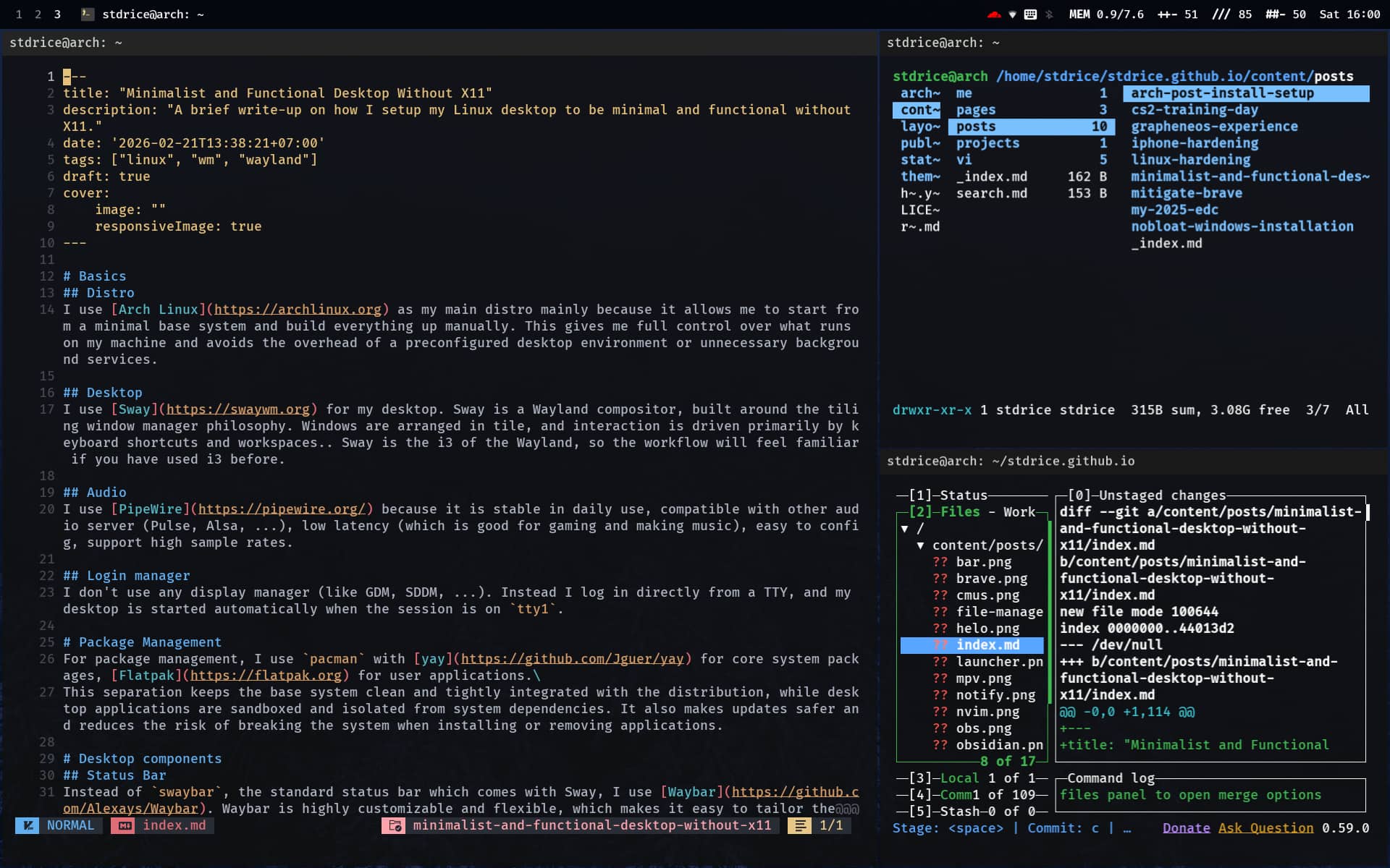 A brief write-up on how I setup my Linux desktop to be minimal and functional without X11....